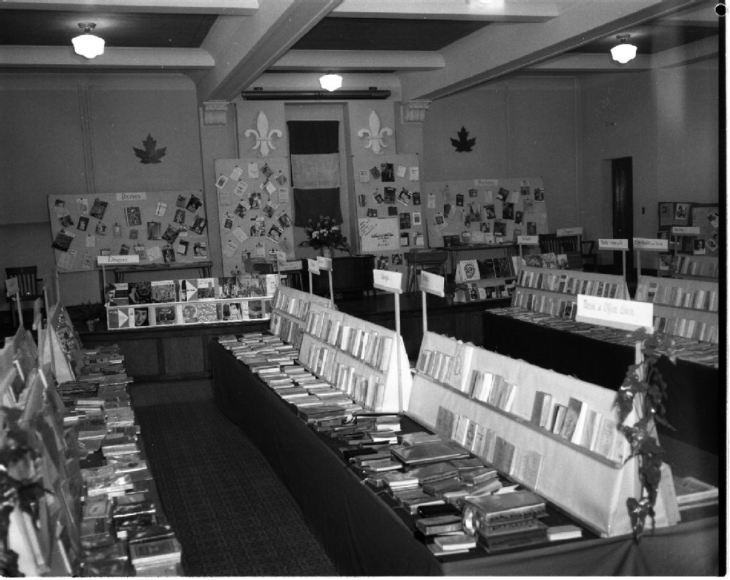 Exposition de livres à l'École Normale, 25 mars 1963, Archives nationales à Gatineau, Fonds Champlain Marcil, (07H,P174,S1,D29932), Marcil, Champlain.
