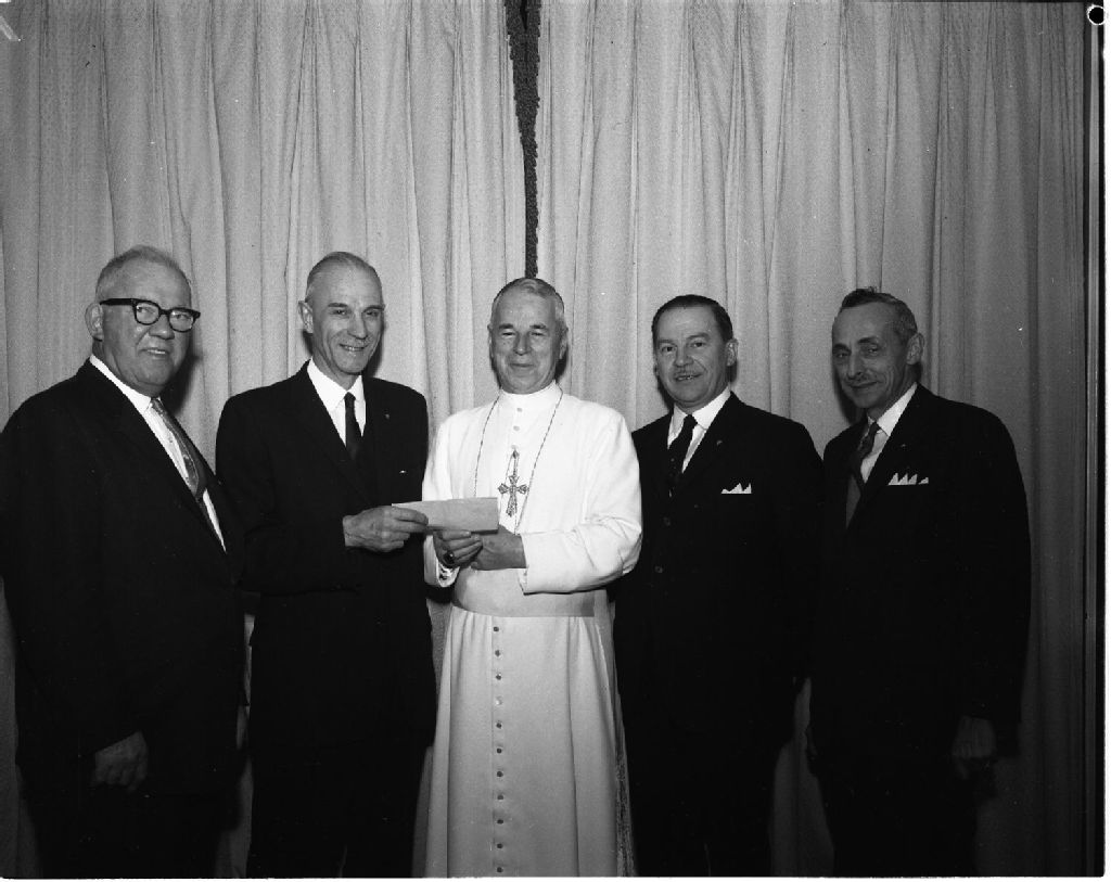 M. Quesnel des Chevaliers de Colomb remettant un chèque à Monseigneur Joseph-Marie Lemieux, 25 mars 1963, Archives nationales à Gatineau, Fonds Champlain Marcil, (07H,P174,S1,D29933), Marcil, Champlain.