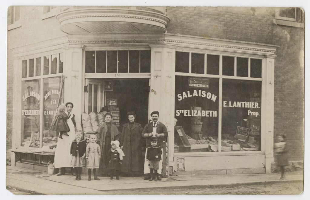 [Famille posant devant le Salaison Sainte-Elizabeth, E. Lanthier, propriétaire]