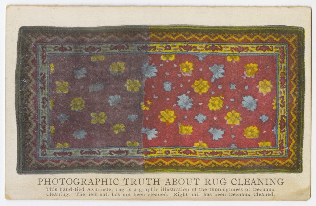 Photographic truth about rug cleaning : this hand-tied Axminster rug is a graphic illustration of the thoroughness of Dechaux cleaning ...