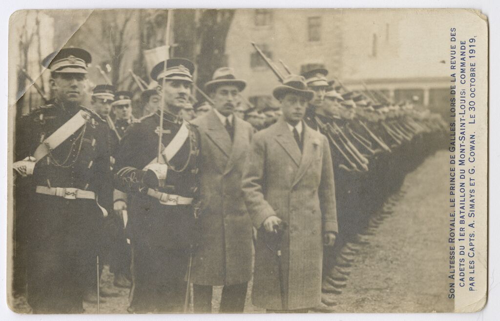 Son altesse royale, le prince de Galles, lors de la revue des cadets du 1er bataillon du Mont-Saint-Louis commandé par les Capts. A. Simays et G. Cowan, le 30 octobre 1919