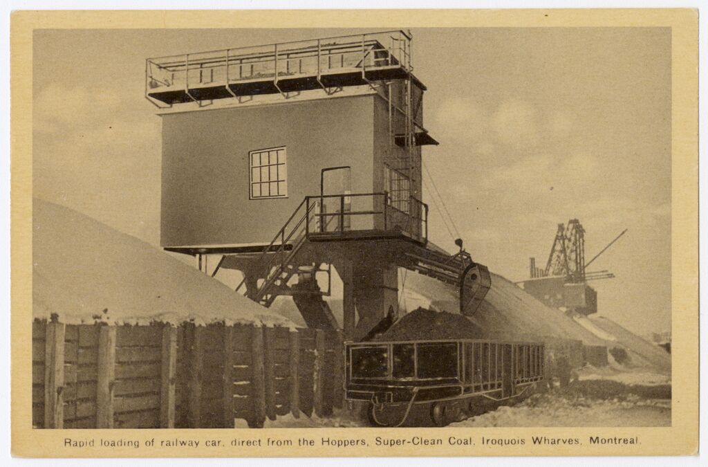 Rapid loading of railway car, direct from the hoppers, supear-clean coal, Iroquois Wharves, Montreal