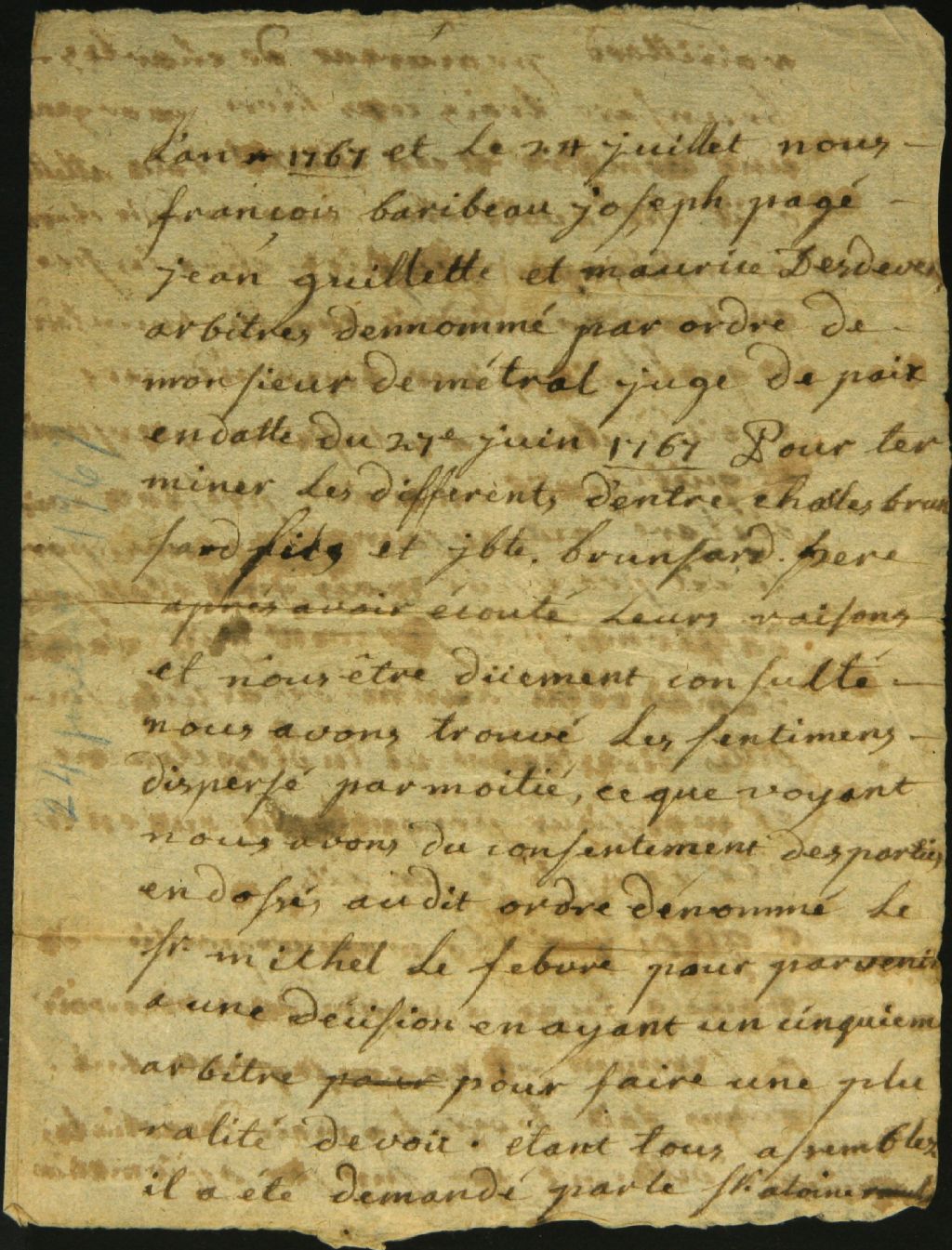 Sentence arbitrale entre Charles et Jean Baptiste Brunsard à propos d'un emplacement situé à la rivière Batiscan