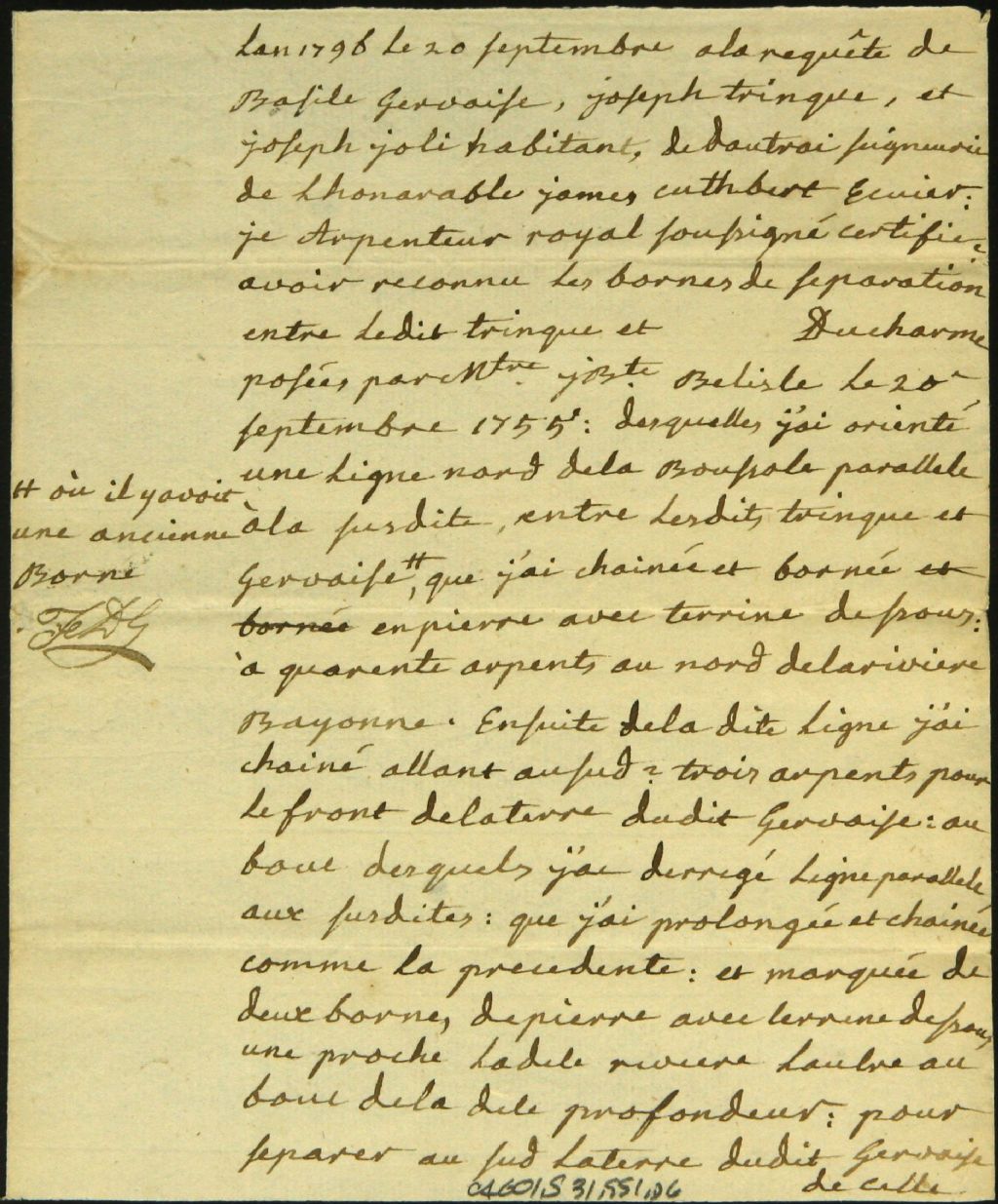 Procès-verbal de bornage, à la requête de Basile Gervaise, Joseph Joli et Joseph Trinque, d'un emplacement situé au Nord de la rivière Bayonne, 20 septembre 1796, Archives nationales à Montréal, Fonds Cour supérieure. District judiciaire de Montréal. Greffes d'arpenteurs, (06M,CA601,S31,SS1,D6).
