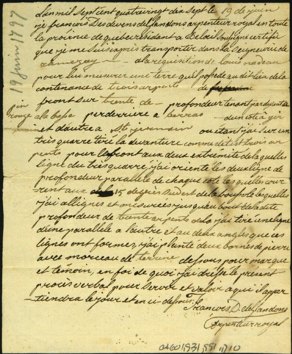 Procès-verbal de mesurage, à la requête de Louis Nadeau, d'une terre située dans la seigneurie de Ramezay, 19 juin 1797, Archives nationales à Montréal, Fonds Cour supérieure. District judiciaire de Montréal. Greffes d'arpenteurs, (06M,CA601,S31,SS1,D10).