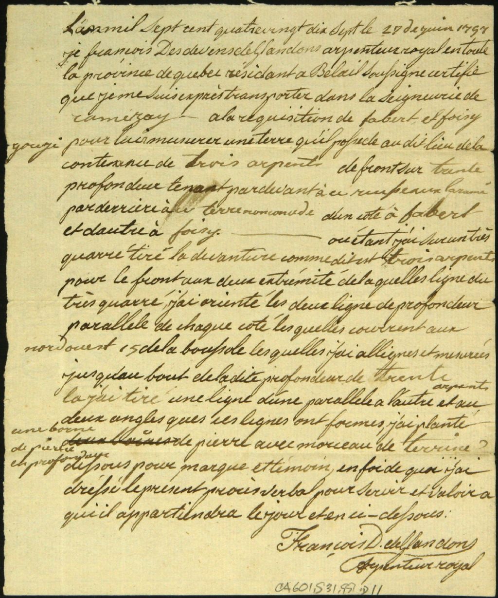 Procès-verbal de mesurage, à la requête de Foisy Gougi et Monsieur Fabert, d'une terre située dans la seigneurie de Ramezay, 27 juin 1797, Archives nationales à Montréal, Fonds Cour supérieure. District judiciaire de Montréal. Greffes d'arpenteurs, (06M,CA601,S31,SS1,D11).