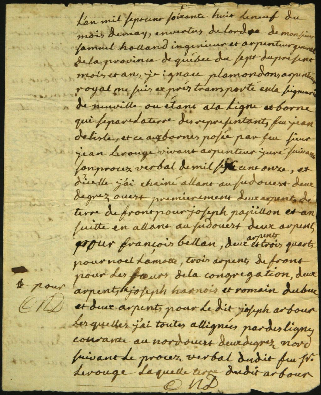 Procès-verbal d'arpentage et de bornage, en vertu d'un ordre de Samuel Holland, ingénieur et arpenteur général de la Province de Québec, d'un emplacement situé dans la seigneurie de Neuville, 9 mai 1768-2 novembre 1773, Archives nationales à Montréal, Fonds Cour supérieure. District judiciaire de Montréal. Greffes d'arpenteurs, (06M,CA601,S18,SS2,D12).