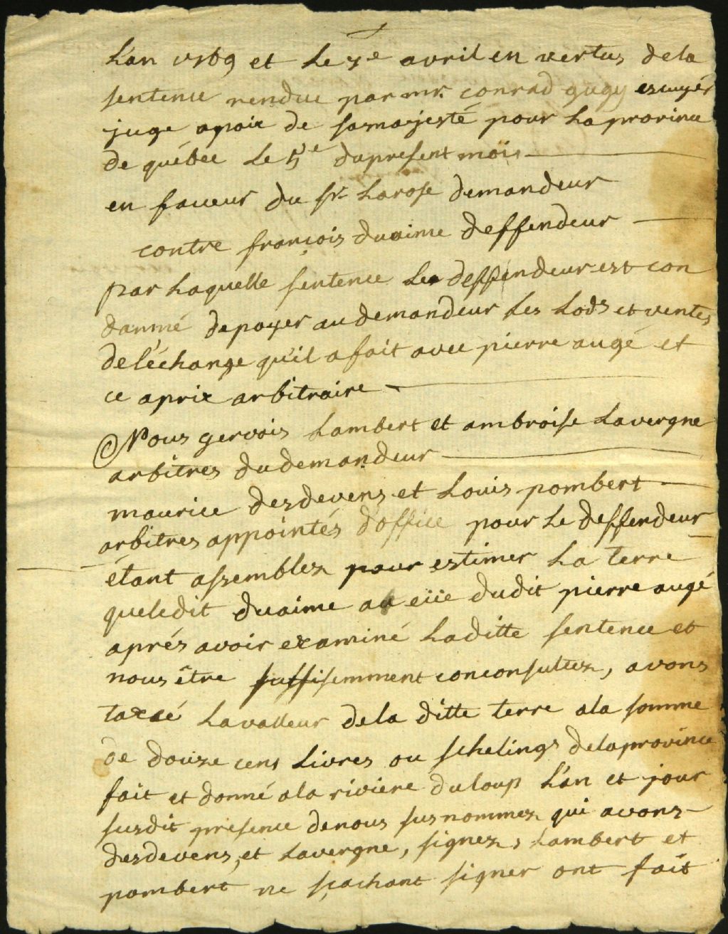 Sentence arbitrale en faveur de Monsieur Larose contre François Duaime à propos d'un emplacement situé à la rivière du Loup, 7 avril 1769, Archives nationales à Montréal, Fonds Cour supérieure. District judiciaire de Montréal. Greffes d'arpenteurs, (06M,CA601,S18,SS2,D34).