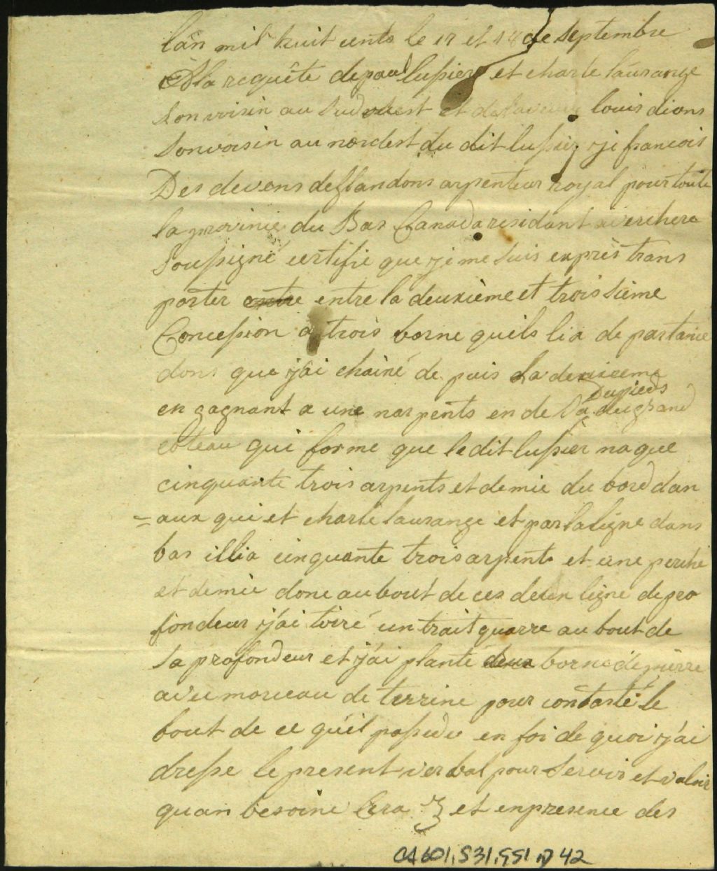 Procès-verbal de bornage, à la requête de la veuve Louis Dion, Charles Laurange et Paul Lussier, d'un emplacement situé entre les 2e et 3e concessions à Verchères, 17 septembre 1800-18 septembre 1800, Archives nationales à Montréal, Fonds Cour supérieure. District judiciaire de Montréal. Greffes d'arpenteurs, (06M,CA601,S31,SS1,D42).