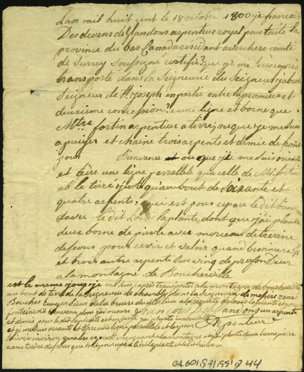 Procès-verbal de bornage, à la requête de Monsieur Bienvenu, Monsieur Fontaine et Louis Laplante, d'un emplacement situé entre les 1ère et 2e concessions de la seigneurie de Saint-Joseph, 18 octobre 1800, Archives nationales à Montréal, Fonds Cour supérieure. District judiciaire de Montréal. Greffes d'arpenteurs, (06M,CA601,S31,SS1,D44).