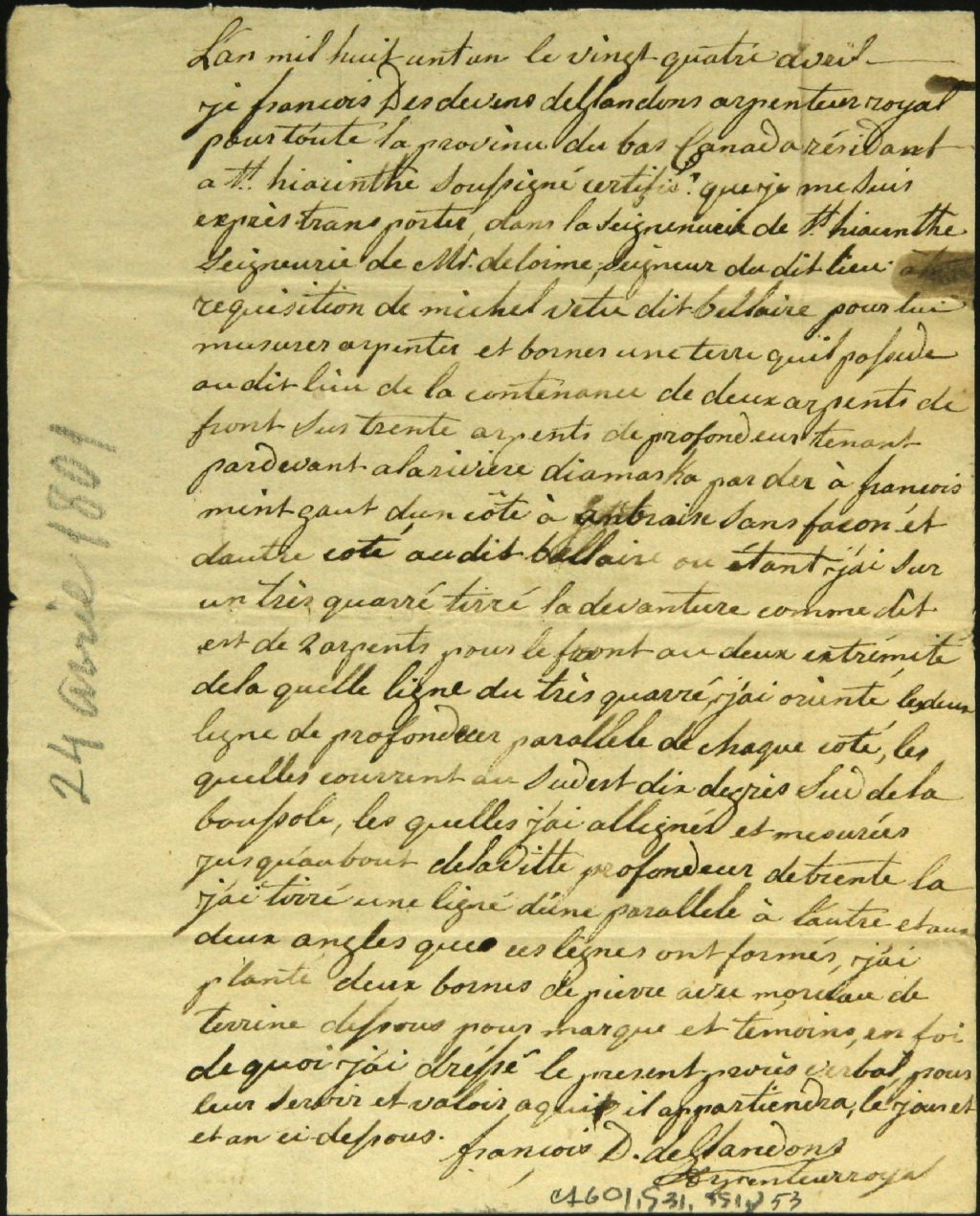 Procès-verbal d'arpentage, de bornage et de mesurage, à la requête de Michel Vêtu dit Bellaire, d'une terre située dans la seigneurie de Saint-Hyacinthe, 24 avril 1801, Archives nationales à Montréal, Fonds Cour supérieure. District judiciaire de Montréal. Greffes d'arpenteurs, (06M,CA601,S31,SS1,D53).