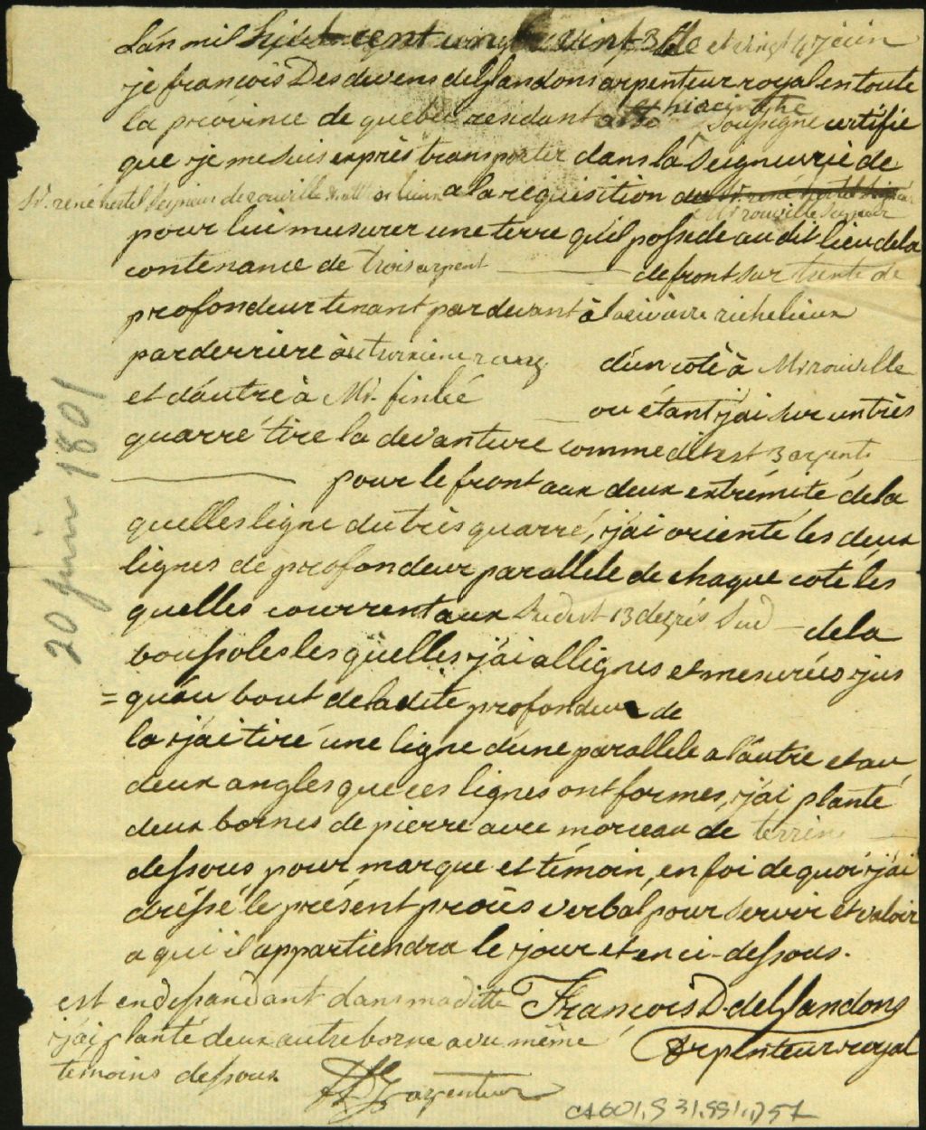 Procès-verbal de mesurage, à la requête de René Hertel de Rouville, d'une terre située dans la seigneurie de Rouville, par devant la rivière Richelieu, 23 juin 1801-24 juin 1801, Archives nationales à Montréal, Fonds Cour supérieure. District judiciaire de Montréal. Greffes d'arpenteurs, (06M,CA601,S31,SS1,D57).