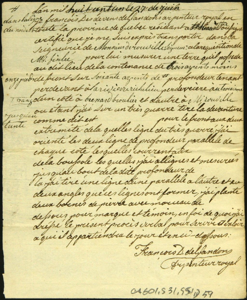 Procès-verbal de mesurage, à la requête de Monsieur Finlie, d'une terre située dans la seigneurie de Monsieur de Rouville, par devant la rivière Richelieu, 27 juin 1801, Archives nationales à Montréal, Fonds Cour supérieure. District judiciaire de Montréal. Greffes d'arpenteurs, (06M,CA601,S31,SS1,D59).