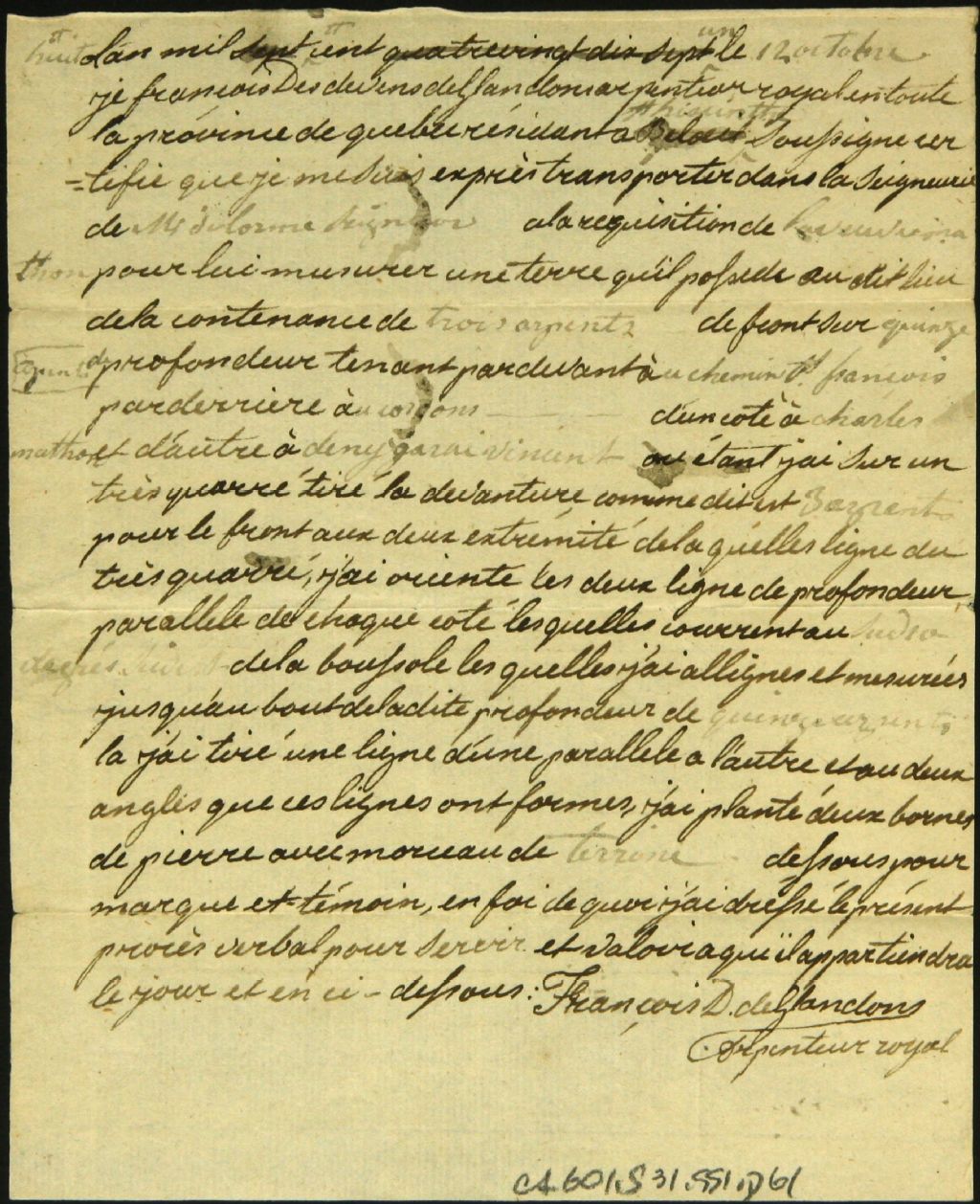 Procès-verbal de mesurage, à la requête de la veuve Mathon, d'une terre située dans la seigneurie Delorme, par devant le chemin Saint-François, 12 octobre 1801, Archives nationales à Montréal, Fonds Cour supérieure. District judiciaire de Montréal. Greffes d'arpenteurs, (06M,CA601,S31,SS1,D61).