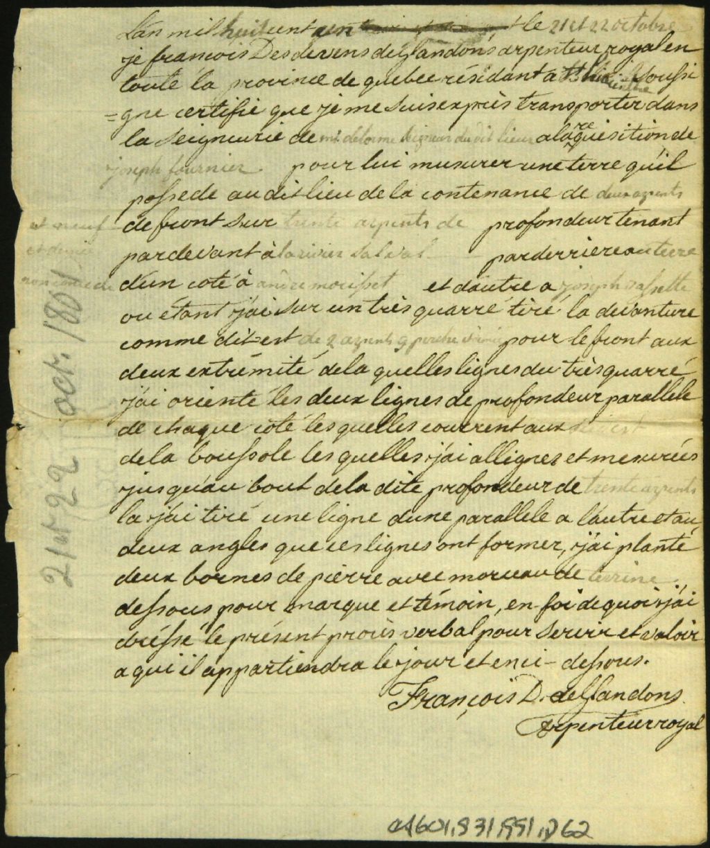 Procès-verbal de mesurage, à la requête de Joseph Fournier, d'une terre située dans la seigneurie Delorme, par devant la rivière Salvail, 21 octobre 1801-22 octobre 1801, Archives nationales à Montréal, Fonds Cour supérieure. District judiciaire de Montréal. Greffes d'arpenteurs, (06M,CA601,S31,SS1,D62).