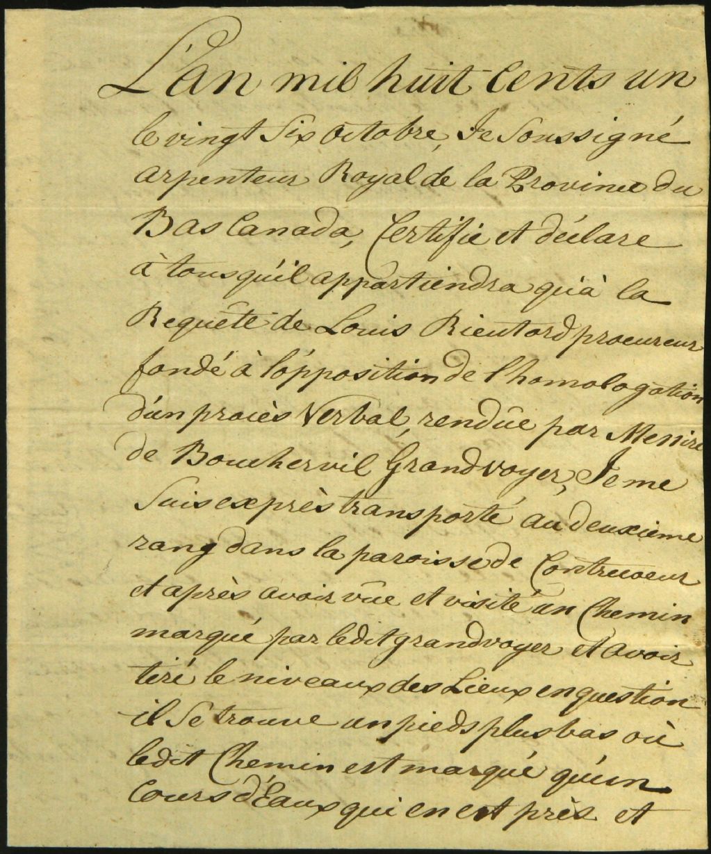 Procès-verbal d'arpentage, à la requête de Louis Rieutard, procureur fondé à l'opposition de l'homologation d'un procès-verbal rédigé par Monsieur de Boucherville, Grand voyer, d'un emplacement situé dans le 2e Rang de la paroisse de Contrecoeur, 26 octobre 1801, Archives nationales à Montréal, Fonds Cour supérieure. District judiciaire de Montréal. Greffes d'arpenteurs, (06M,CA601,S31,SS1,D63).