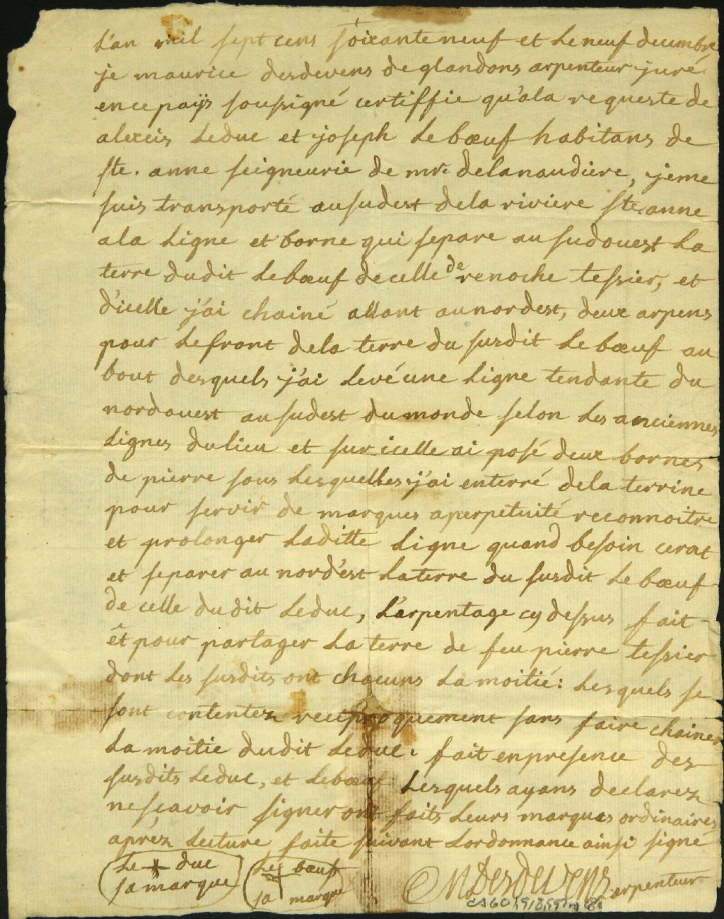 Procès-verbal d'arpentage et de bornage, à la requête de Joseph Leboeuf et Alexis Leduc, d'un emplacement situé au Sud-Est de la rivière Sainte-Anne dans la seigneurie de Sainte-Anne, 9 décembre 1769, Archives nationales à Montréal, Fonds Cour supérieure. District judiciaire de Montréal. Greffes d'arpenteurs, (06M,CA601,S18,SS2,D68).
