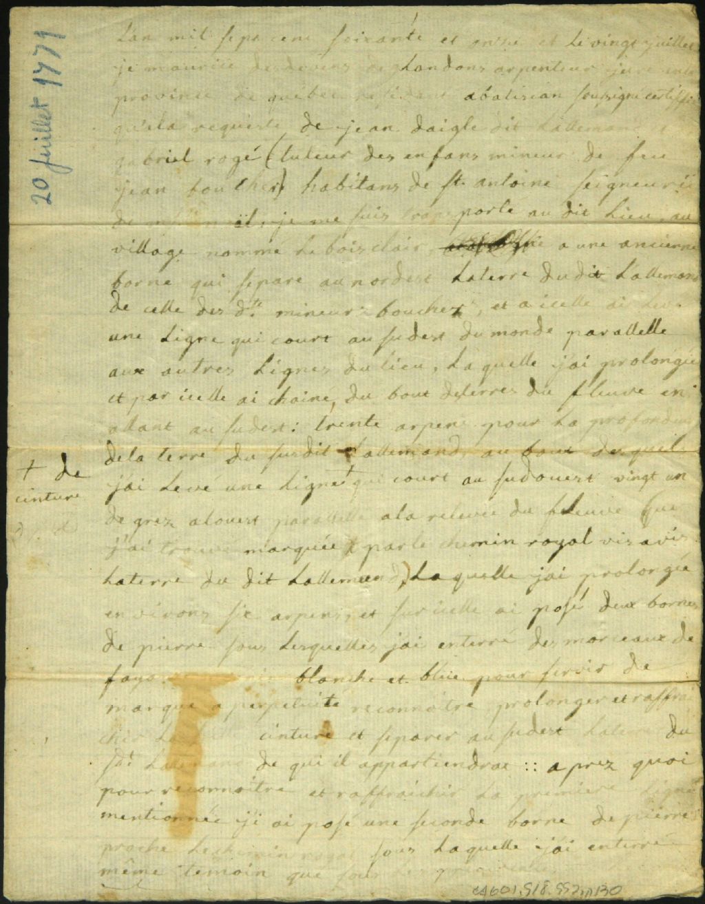 Procès-verbal de bornage, à la requête de Jean Daigle dit Lallemand et Gabriel Rogé, d'un emplacement situé à Saint-Antoine, 20 juillet 1771, Archives nationales à Montréal, Fonds Cour supérieure. District judiciaire de Montréal. Greffes d'arpenteurs, (06M,CA601,S18,SS2,D130).