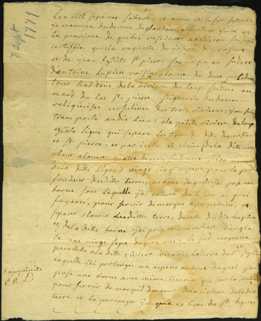 Procès-verbal d'arpentage et de bornage, à la requête de Joseph Desrosiers, Antoine Lupien et Jean Baptiste Saint-Pierre, d'un emplacement situé au Nord du lac Saint-Pierre dans la seigneurie des Ursulines de Trois-Rivières, 7 septembre 1771, Archives nationales à Montréal, Fonds Cour supérieure. District judiciaire de Montréal. Greffes d'arpenteurs, (06M,CA601,S18,SS2,D145).
