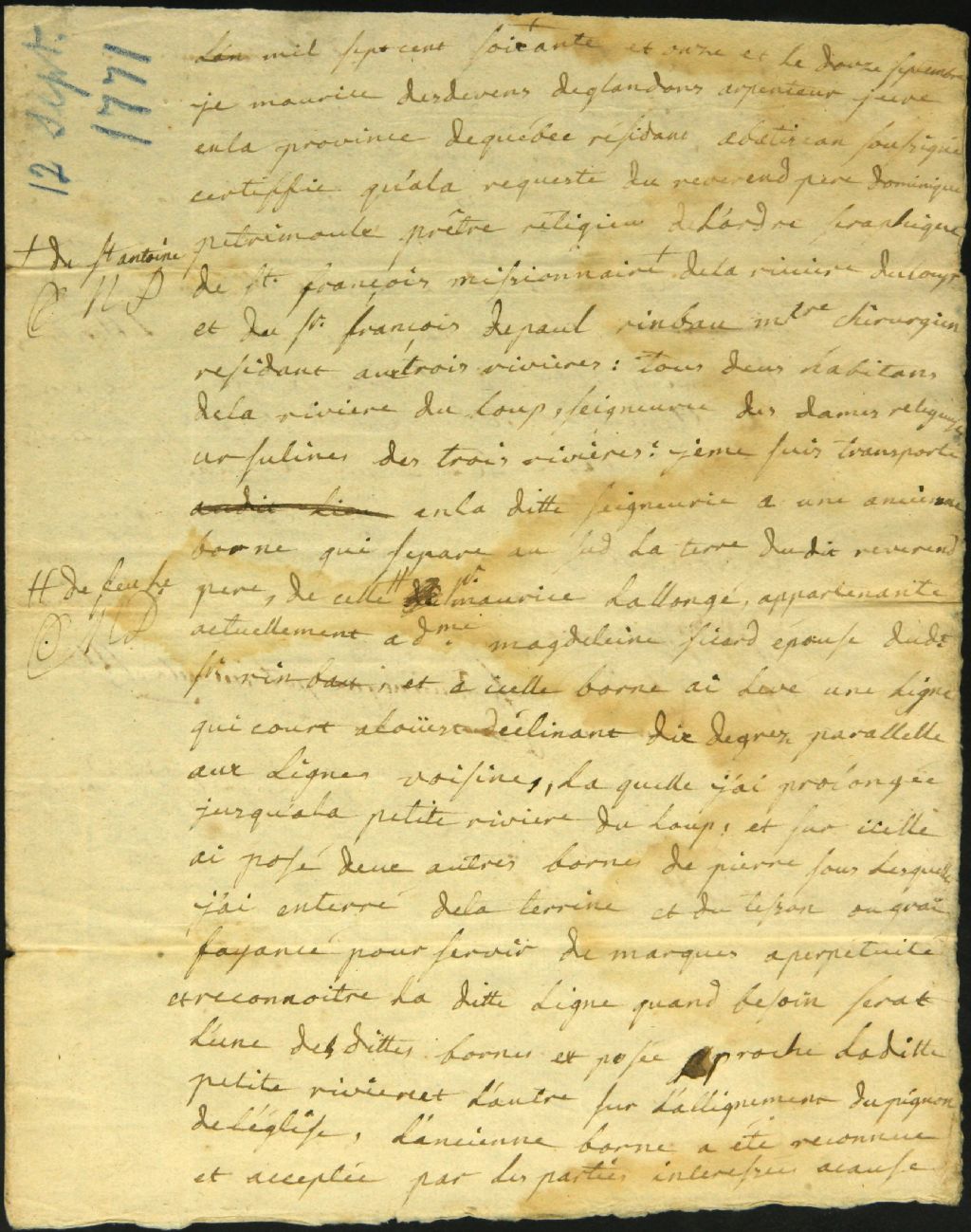 Procès-verbal d'arpentage et de bornage, à la requête du Père Dominique Petrimoulx et François Depaul Rinbau, maître chirurgien, d'un emplacement situé à la rivière du Loup, 12 septembre 1771-25 septembre 1771, Archives nationales à Montréal, Fonds Cour supérieure. District judiciaire de Montréal. Greffes d'arpenteurs, (06M,CA601,S18,SS2,D146).