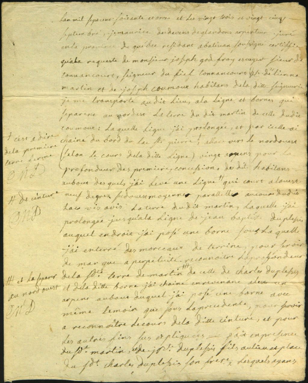 Procès-verbal d'arpentage et de bornage, à la requête de Joseph Godfroy, sieur de Tonnancourt, et Joseph Coumoux et Étienne Martin, d'un emplacement situé à la Pointe-du-Lac, 23 septembre 1771-25 septembre 1771, Archives nationales à Montréal, Fonds Cour supérieure. District judiciaire de Montréal. Greffes d'arpenteurs, (06M,CA601,S18,SS2,D147).