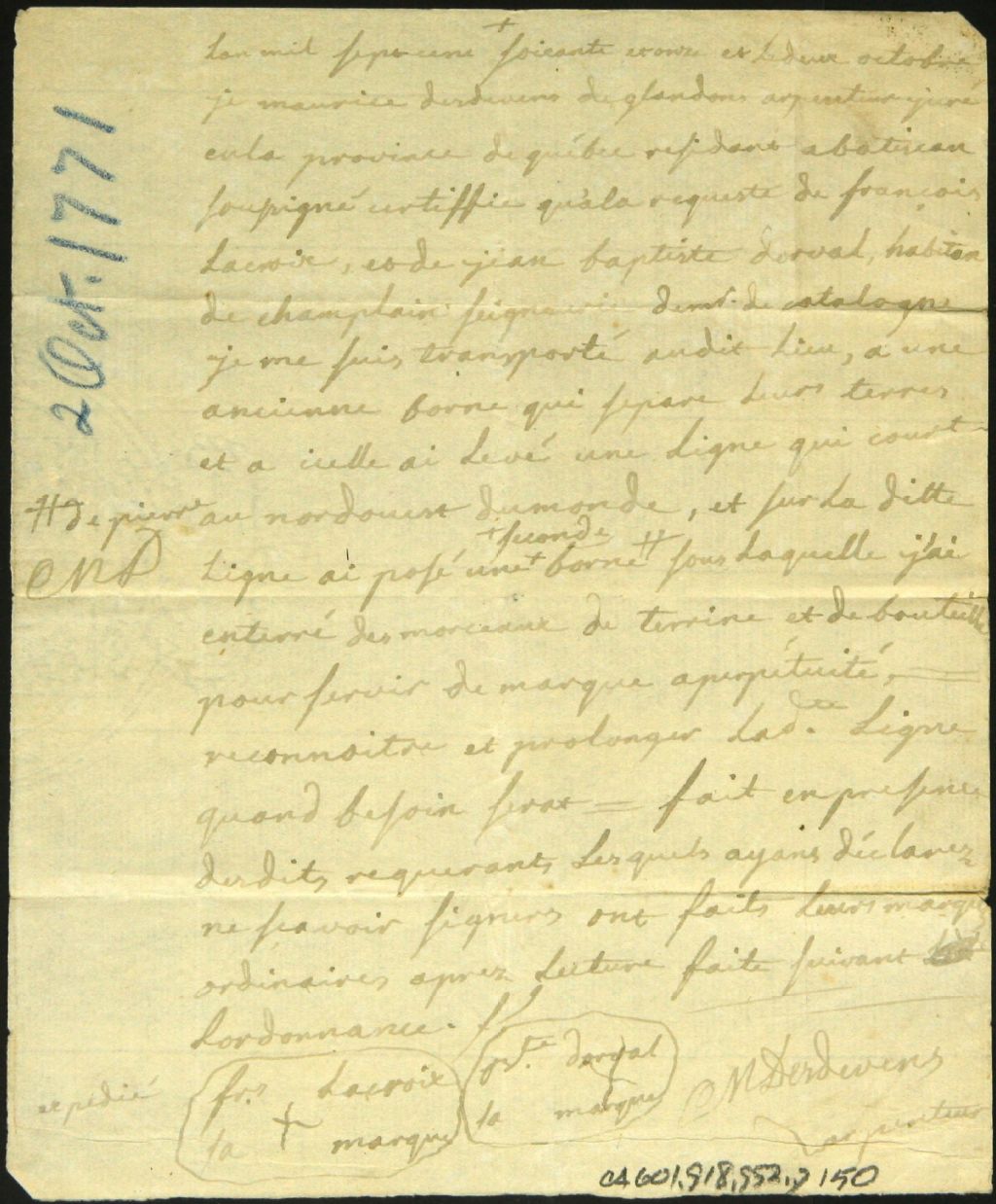 Procès-verbal de bornage, à la requête de Jean Baptiste Dorval et François Lacroix, d'un emplacement situé à Champlain, 2 octobre 1771, Archives nationales à Montréal, Fonds Cour supérieure. District judiciaire de Montréal. Greffes d'arpenteurs, (06M,CA601,S18,SS2,D150).