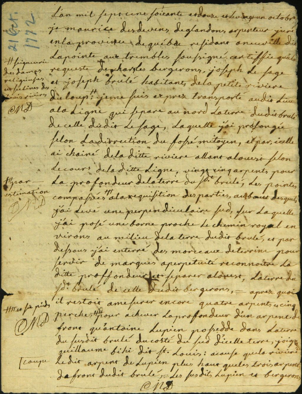 Procès-verbal d'arpentage et de bornage, à la requête de Charles Bergeron, Joseph Brulé et Joseph Lesage, d'un emplacement situé à la petite rivière du Loup dans la seigneurie des Ursulines, 21 octobre 1772, Archives nationales à Montréal, Fonds Cour supérieure. District judiciaire de Montréal. Greffes d'arpenteurs, (06M,CA601,S18,SS2,D183).