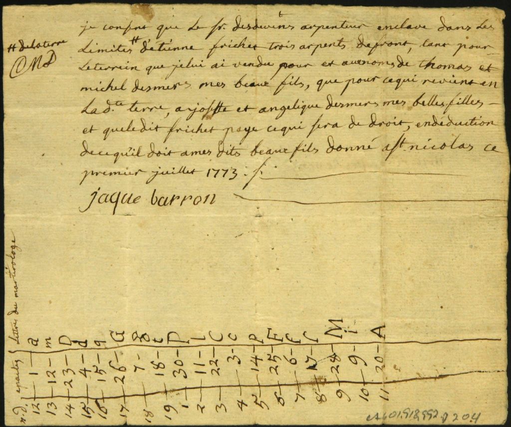 Accord d'arpentage par Jaque Barron d'un emplacement situé à Saint-Nicolas, 1 juillet 1773, Archives nationales à Montréal, Fonds Cour supérieure. District judiciaire de Montréal. Greffes d'arpenteurs, (06M,CA601,S18,SS2,D204).