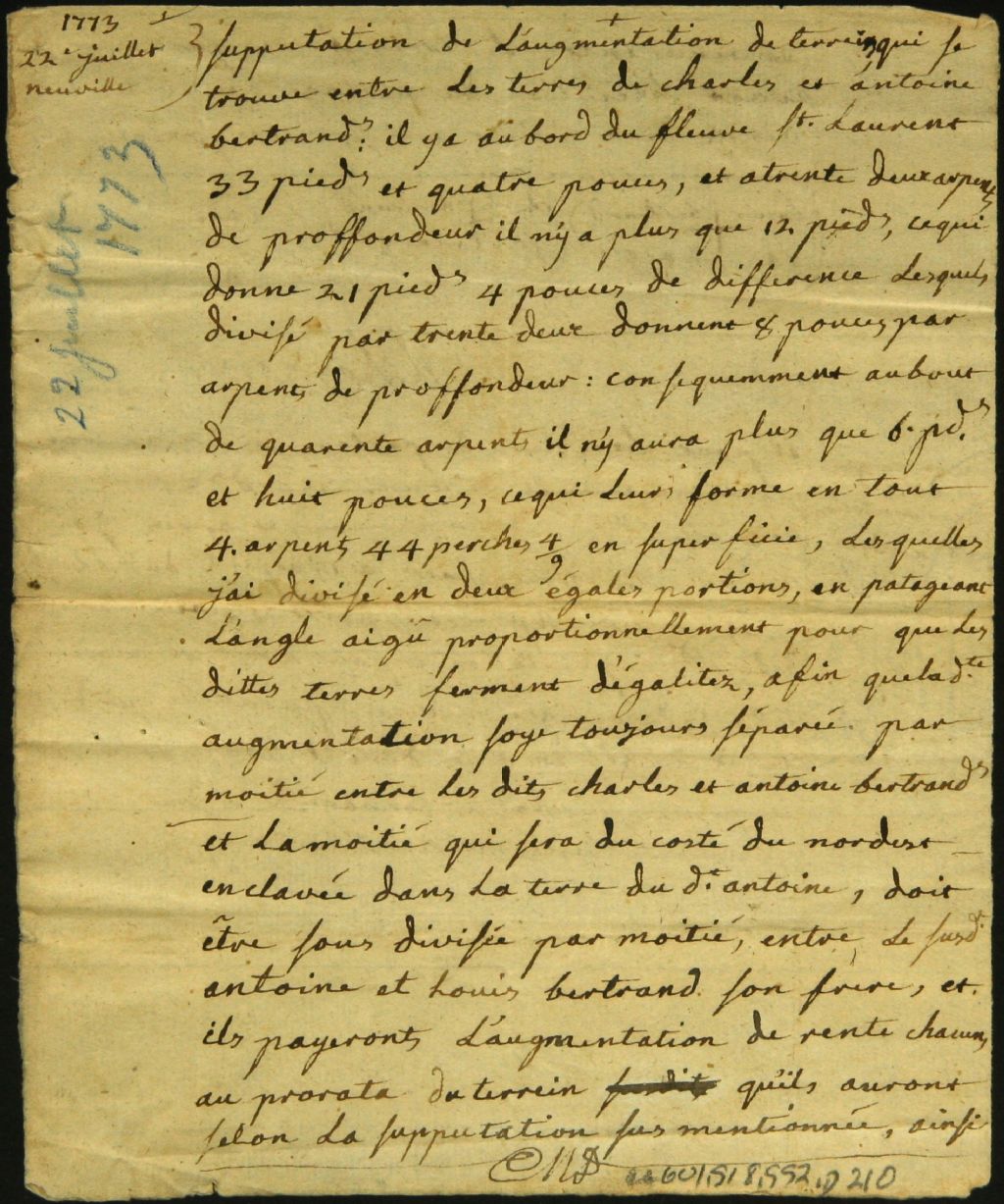 Supputation de l'augmentation de terrain qui se trouve entre les terres d'Antoine et Charles Bertrand situées à Neuville dans la seigneurie de Monsieur Brassard Deschenaux, 22 juillet 1773, Archives nationales à Montréal, Fonds Cour supérieure. District judiciaire de Montréal. Greffes d'arpenteurs, (06M,CA601,S18,SS2,D210).