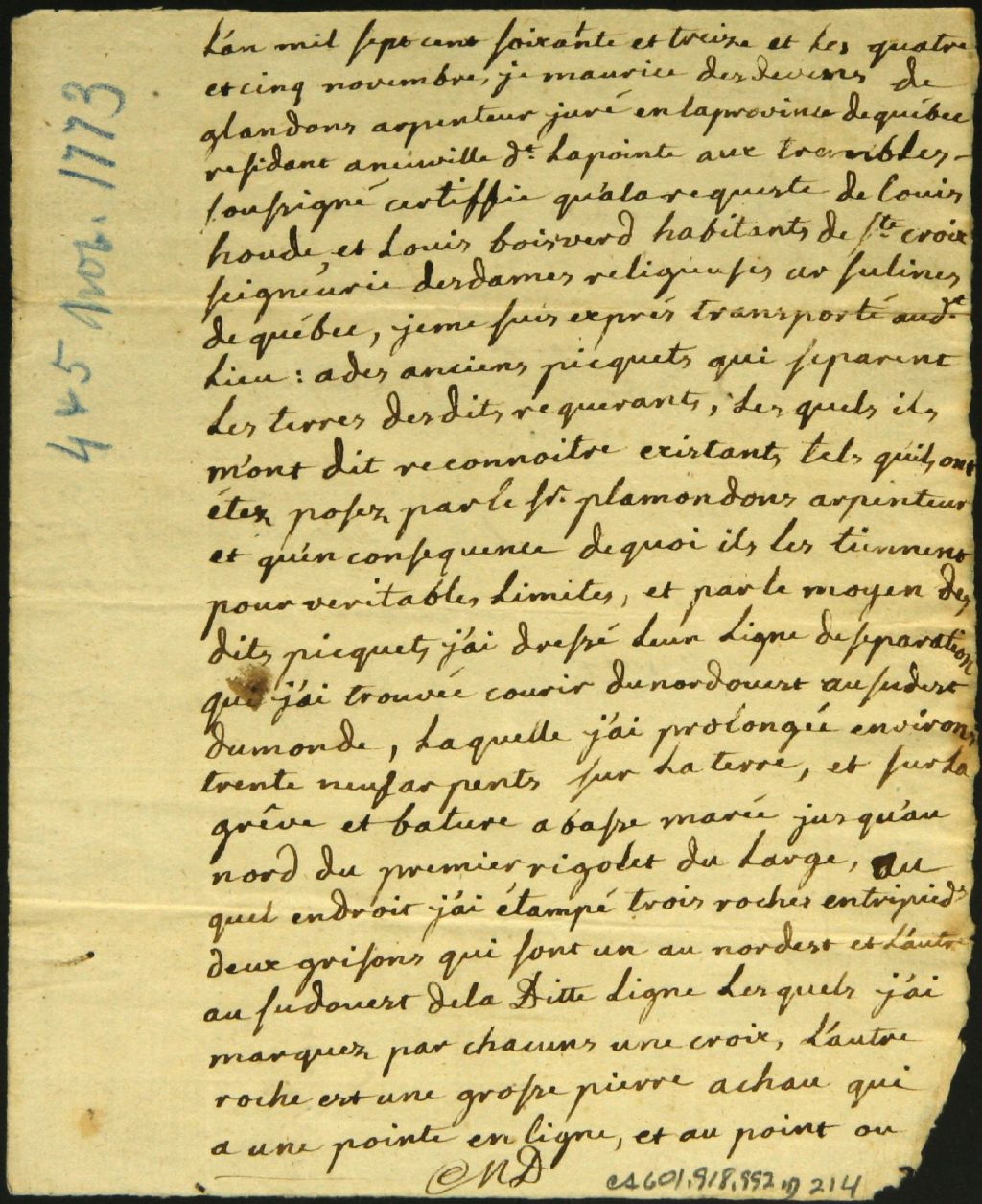 Procès-verbal d'arpentage, à la requête de Louis Boisverd et Louis Houde, d'un emplacement situé à Sainte-Croix, dans la seigneurie des Ursulines de Québec, 4 novembre 1773-5 novembre 1773, Archives nationales à Montréal, Fonds Cour supérieure. District judiciaire de Montréal. Greffes d'arpenteurs, (06M,CA601,S18,SS2,D214).