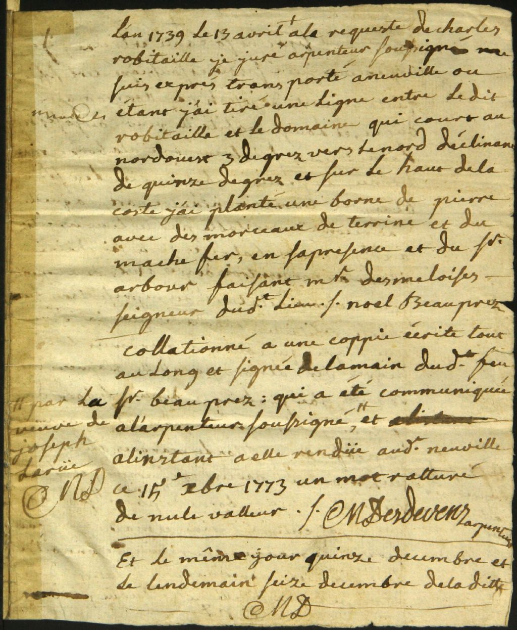 - Procès-verbal d'arpentage et de bornage, à la requête de Charles Robitaille, de terres situées à Neuville dans la seigneurie de Monsieur Brassard Deschenaux
