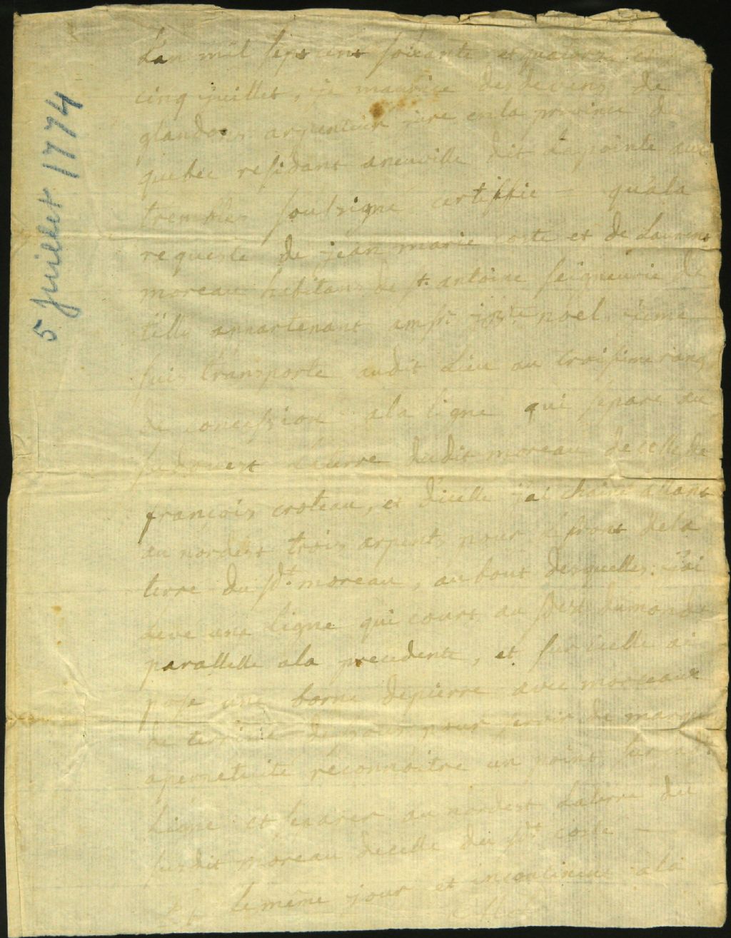 Procès-verbal de bornage, à la requête de Jean Marie Costé et Laurent Moreau, d'un emplacement situé à Saint-Antoine dans la seigneurie de Tilly, 5 juillet 1774, Archives nationales à Montréal, Fonds Cour supérieure. District judiciaire de Montréal. Greffes d'arpenteurs, (06M,CA601,S18,SS2,D227).