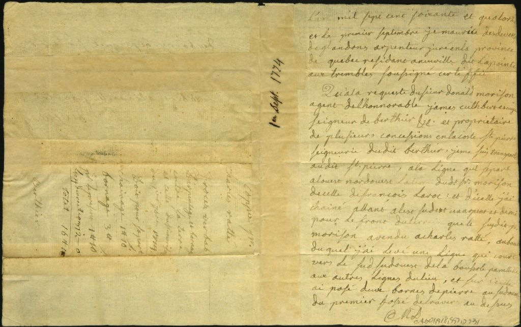 Procès-verbal d'arpentage et de bornage, à la requête de Donald Morison, agent de James Cuthbert, et Charles Ratté, d'un emplacement situé à Berthier dans la seigneurie du dit Cuthbert, 1 septembre 1774, Archives nationales à Montréal, Fonds Cour supérieure. District judiciaire de Montréal. Greffes d'arpenteurs, (06M,CA601,S18,SS2,D231).