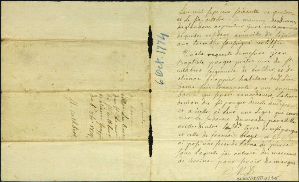 Procès-verbal de bornage, à la requête d'Étienne Frappier et Jean Baptiste Pouget, prêtre et curé de la paroisse de Saint-Cuthbert, de terres situées à Saint-Cuthbert dans la seigneurie de Berthier, 6 octobre 1774, Archives nationales à Montréal, Fonds Cour supérieure. District judiciaire de Montréal. Greffes d'arpenteurs, (06M,CA601,S18,SS2,D235).