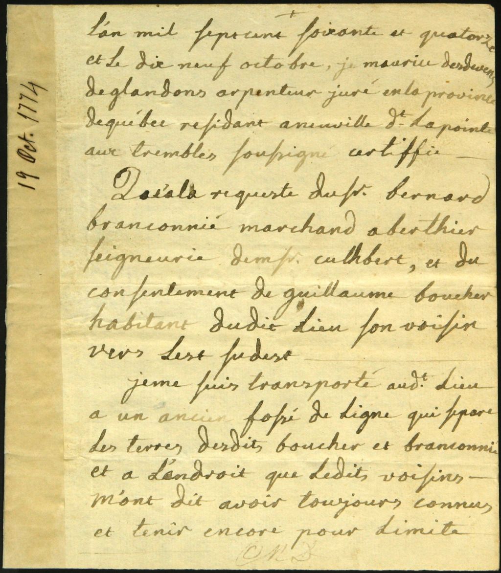 Procès-verbal d'arpentage, à la suite du consentement de Guillaume Boucher et à la requête de Bernard Branconnié, marchand, de leurs terres situées à Berthier dans la seigneurie de James Cuthbert, 19 octobre 1774-4 novembre 1774, Archives nationales à Montréal, Fonds Cour supérieure. District judiciaire de Montréal. Greffes d'arpenteurs, (06M,CA601,S18,SS2,D236).