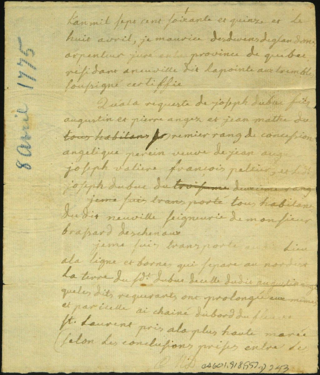 Procès-verbal de bornage, à la requête d'Augustin et Pierre Auger, Joseph Dubuc, fils, Jean Mathe, François Peltier, Angélique Perein et Joseph Valière, d'emplacements situés dans les 2e et 3e Rangs de Neuville, 8 avril 1775, Archives nationales à Montréal, Fonds Cour supérieure. District judiciaire de Montréal. Greffes d'arpenteurs, (06M,CA601,S18,SS2,D253).