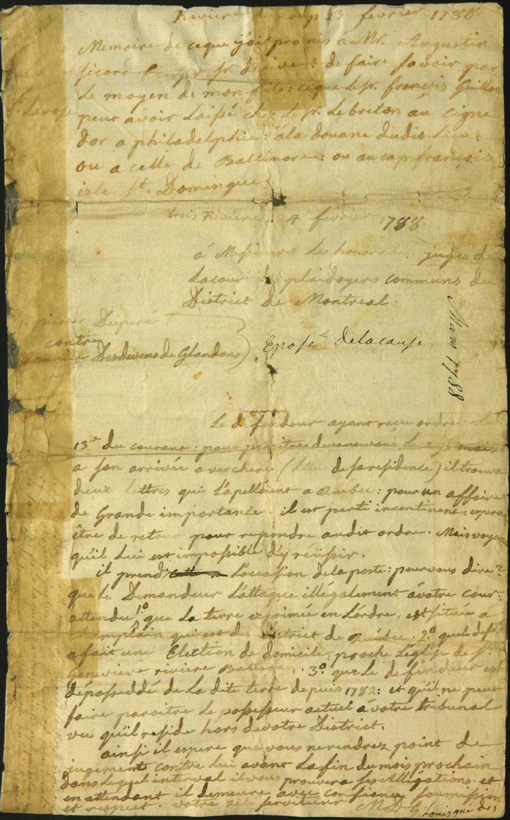 Exposé de la cause de Maurice Desdevens de Glandon demandant au gouverneur Guy Dorchester de la rétablir dans sa fonction d'arpenteur avec référence à l'obtention du pardon de ses faits contre le Gouvernement en mai 1787, Février 1788-mars 1788, Archives nationales à Montréal, Fonds Cour supérieure. District judiciaire de Montréal. Greffes d'arpenteurs, (06M,CA601,S18,SS2,D281).