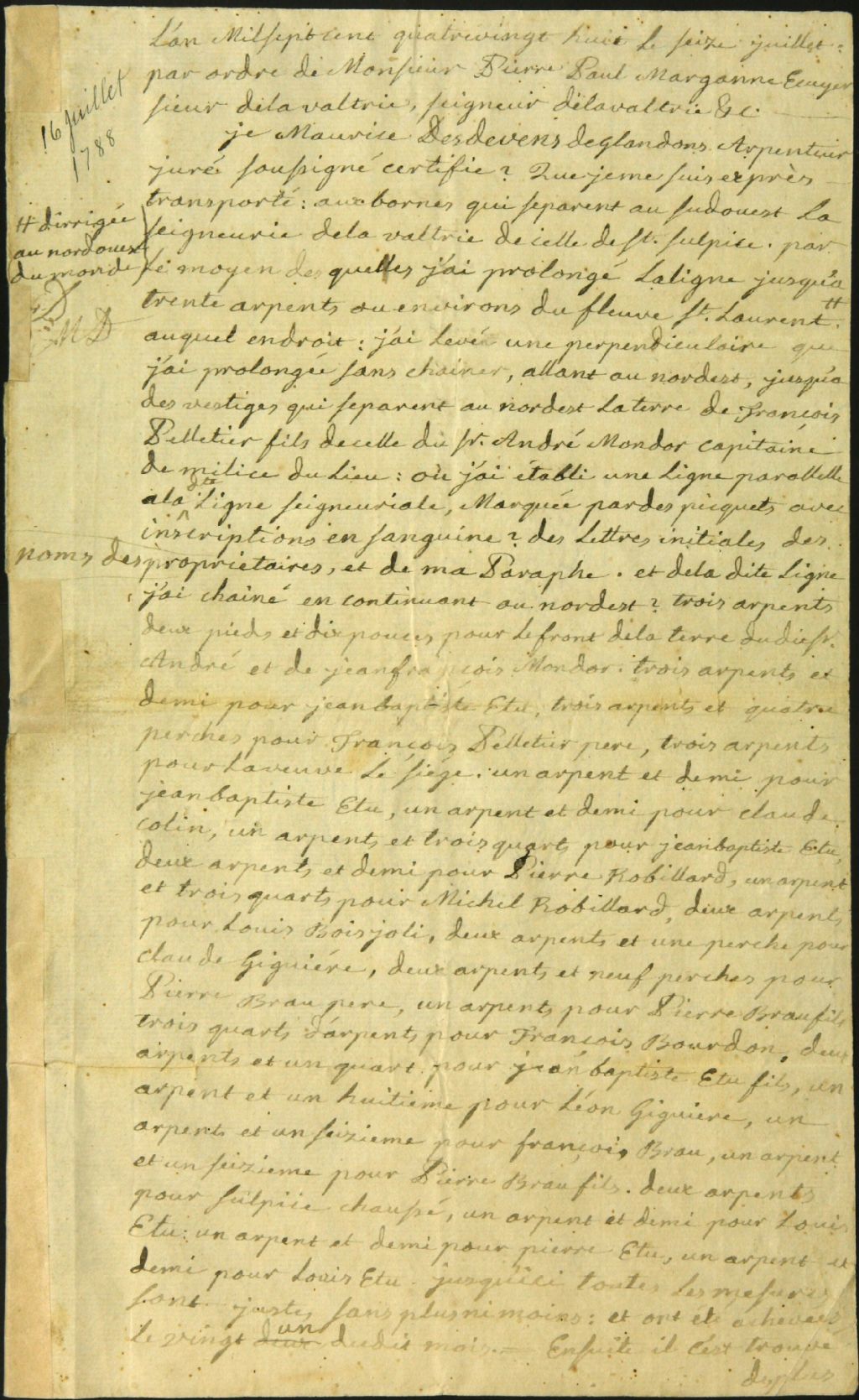 - Procès-verbal d'arpentage, en vertu d'un ordre de Pierre Paul Marganne, seigneur de Lavaltrie, d'un emplacement situé dans la dite seigneurie