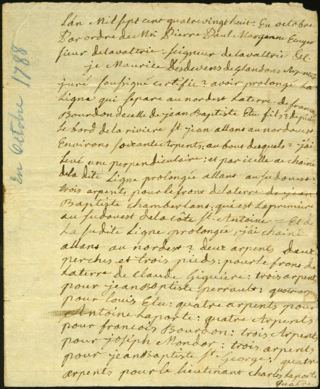 Procès-verbal d'arpentage et de bornage, en vertu d'un ordre de Pierre Paul Marganne, seigneur de Lavaltrie, d'un emplacement situé à la côte Saint-Antoine de la dite seigneurie, Octobre 1788, Archives nationales à Montréal, Fonds Cour supérieure. District judiciaire de Montréal. Greffes d'arpenteurs, (06M,CA601,S18,SS2,D292).