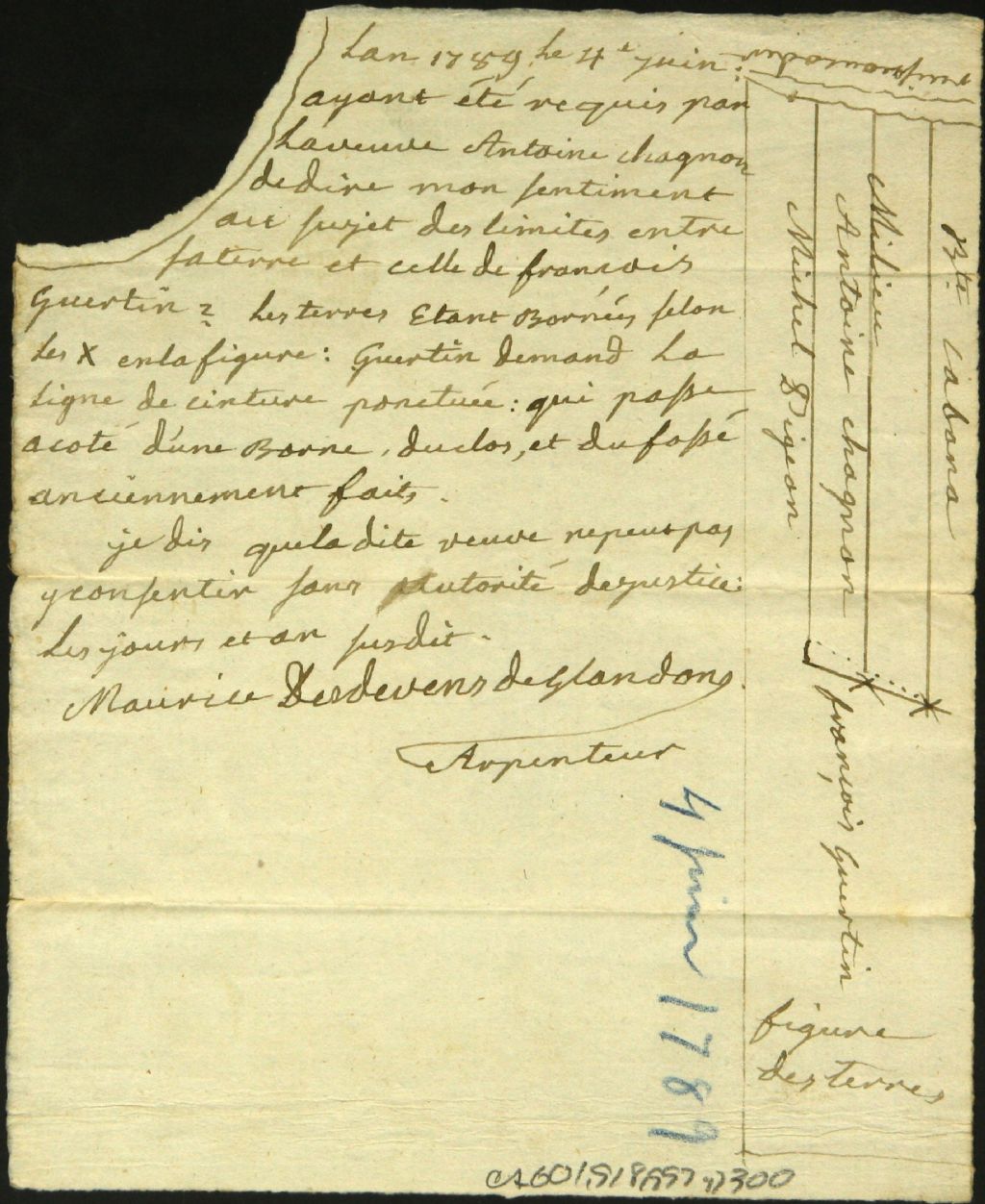 - Rapport des différends et plan entre la veuve Chagon et François Guertin à propos d'un emplacement situé à Verchères