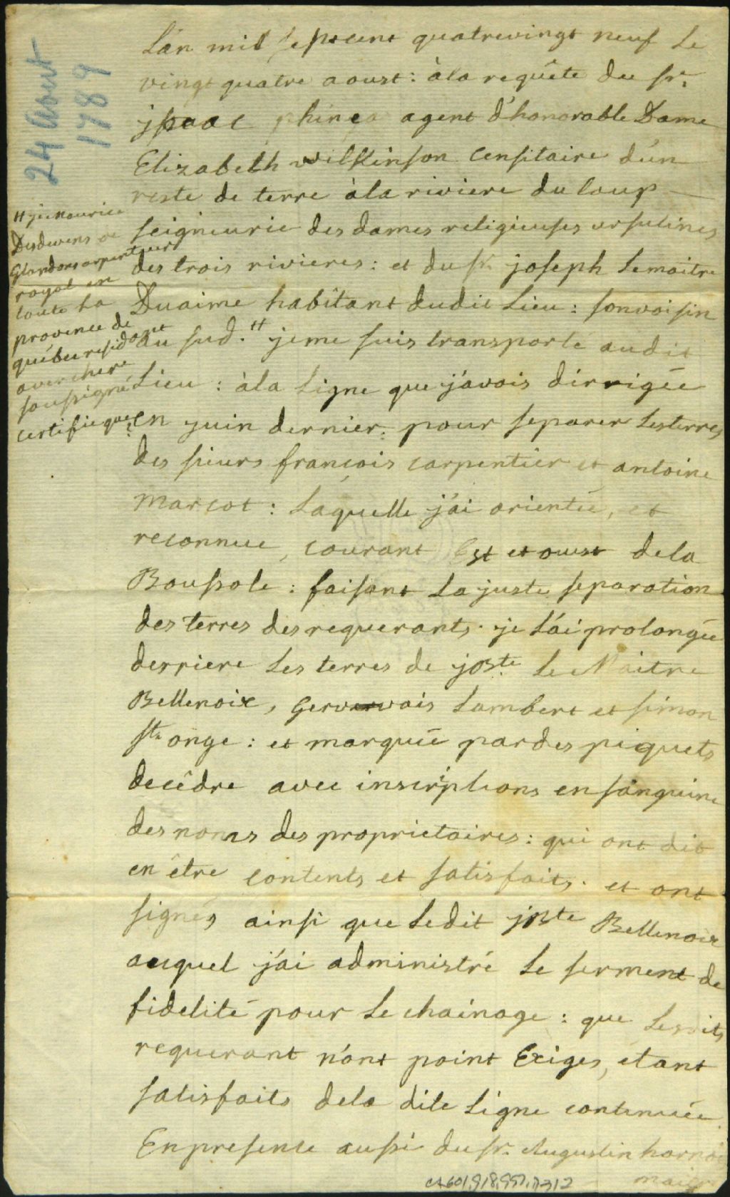 Procès-verbal d'arpentage, à la requête de Monsieur Phinea, censitaire et agent d'Elizabeth Wilkinson, et de Joseph Lemaître Duaime, d'un emplacement situé à la rivière du Loup dans la seigneurie des Ursulines de Trois-Rivières, 24 août 1789, Archives nationales à Montréal, Fonds Cour supérieure. District judiciaire de Montréal. Greffes d'arpenteurs, (06M,CA601,S18,SS2,D312).