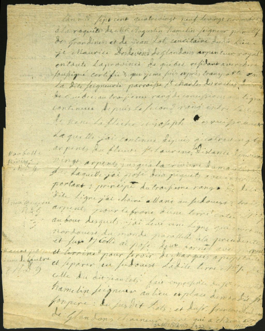 Procès-verbal de bornage, à la requête d'Augustin Hamelin, seigneur primitif des Grondines, paroisse de Saint-Charles-des-Roches, et Jean Lots, d'un emplacement situé dans le 3e Rang de la dite seigneurie, 20 novembre 1789, Archives nationales à Montréal, Fonds Cour supérieure. District judiciaire de Montréal. Greffes d'arpenteurs, (06M,CA601,S18,SS2,D322).