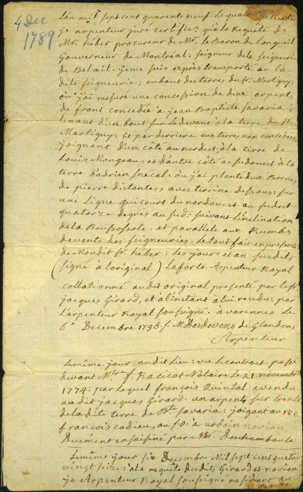 Procès-verbal d'arpentage des terres de François Cadieu, Charles Deselle, Jacques Girard, Louis Lalumière, Joseph Lussier, Joseph Messier, Christophe et Joseph Monjeau, Urbain Novion, Louis Prévost et Joseph Savaria situées à Beloeil, derrière Varennes, Décembre 1789, Archives nationales à Montréal, Fonds Cour supérieure. District judiciaire de Montréal. Greffes d'arpenteurs, (06M,CA601,S18,SS2,D325).