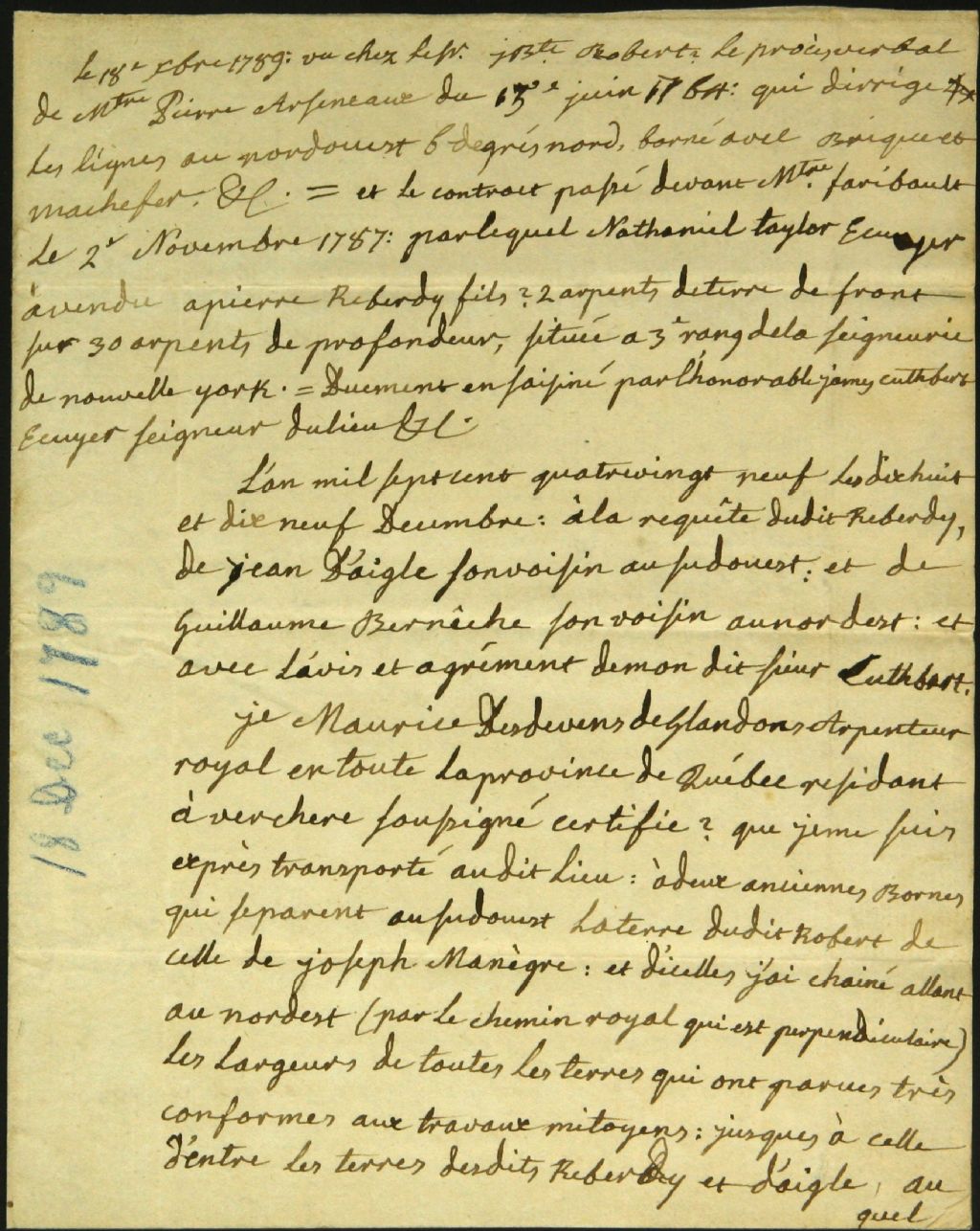 Procès-verbal de bornage, à la requête de Guillaume Bernèche, Jean d'Aigle et Pierre Reberdy, d'un emplacement situé dans le 3e Rang de la seigneurie de la Nouvelle-York