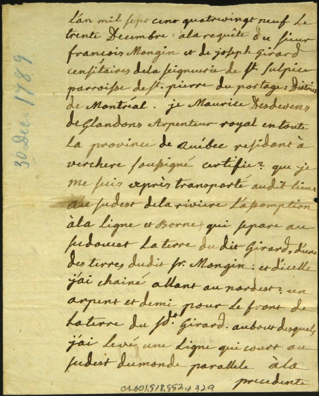 Procès-verbal d'arpentage et de bornage, à la requête de Joseph Girard et François Mongin, censitaires de la seigneurie de Saint-Sulpice, paroisse de Saint-Pierre-du-Portage, d'un emplacement situé au Sud-Ouest de la rivière l'Assomption dans le dit lieu, 30 décembre 1789, Archives nationales à Montréal, Fonds Cour supérieure. District judiciaire de Montréal. Greffes d'arpenteurs, (06M,CA601,S18,SS2,D329).
