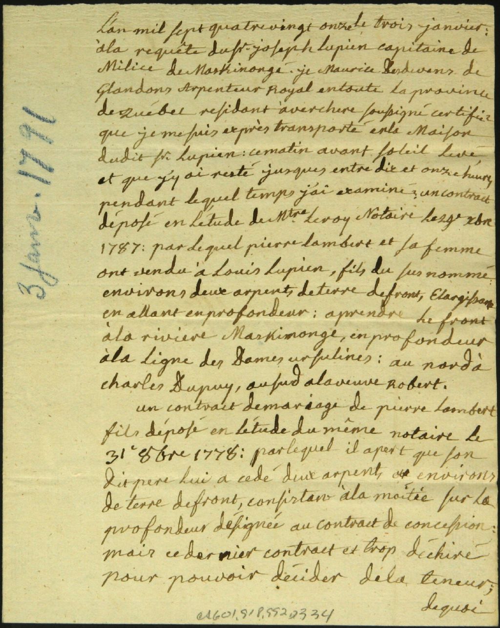 Procès-verbal des contestations entre Joseph Lupien, capitaine de la milice de Maskinongé, et Pierre Lambert à propos d'un emplacement situé à la rivière Maskinongé, 3 janvier 1791, Archives nationales à Montréal, Fonds Cour supérieure. District judiciaire de Montréal. Greffes d'arpenteurs, (06M,CA601,S18,SS2,D334).