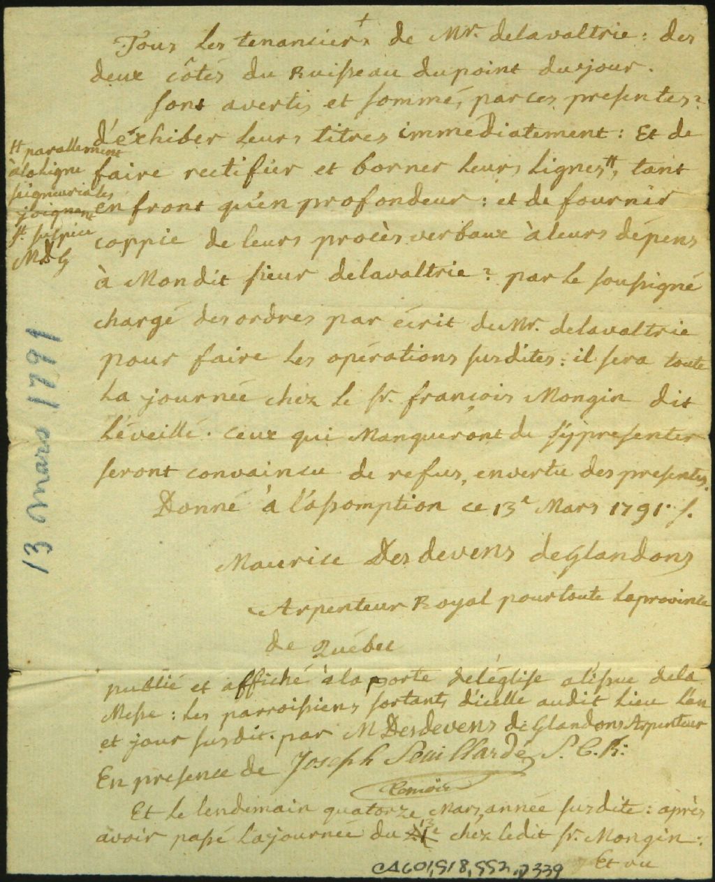 Rapport relatif au ruisseau du Point du Jour dans la seigneurie de Lavaltrie, 13 mars 1791-14 mars 1791, Archives nationales à Montréal, Fonds Cour supérieure. District judiciaire de Montréal. Greffes d'arpenteurs, (06M,CA601,S18,SS2,D339).