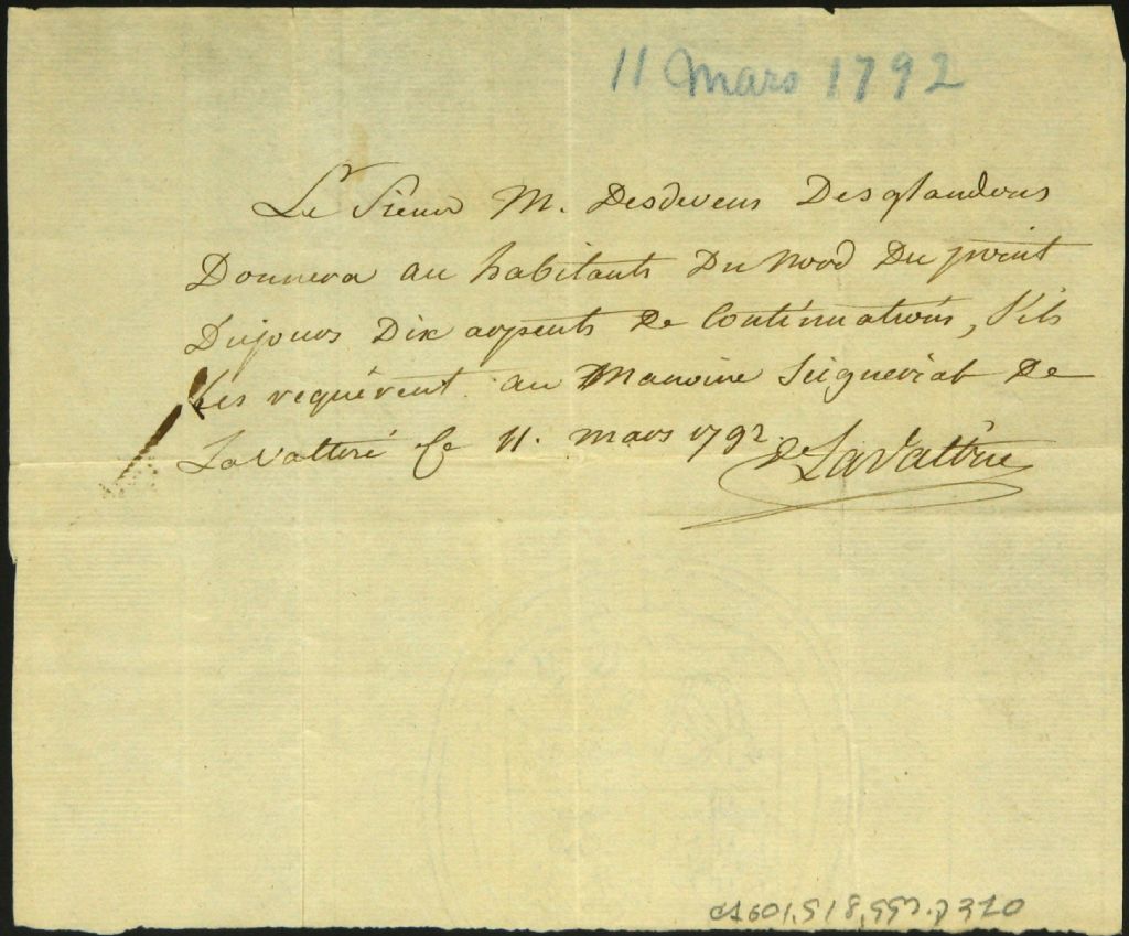 Ordre du sieur de Lavaltrie de concéder dix arpents de terre situés au Nord du Point du Jour dans la seigneurie de Lavaltrie, 11 mars 1792, Archives nationales à Montréal, Fonds Cour supérieure. District judiciaire de Montréal. Greffes d'arpenteurs, (06M,CA601,S18,SS2,D370).