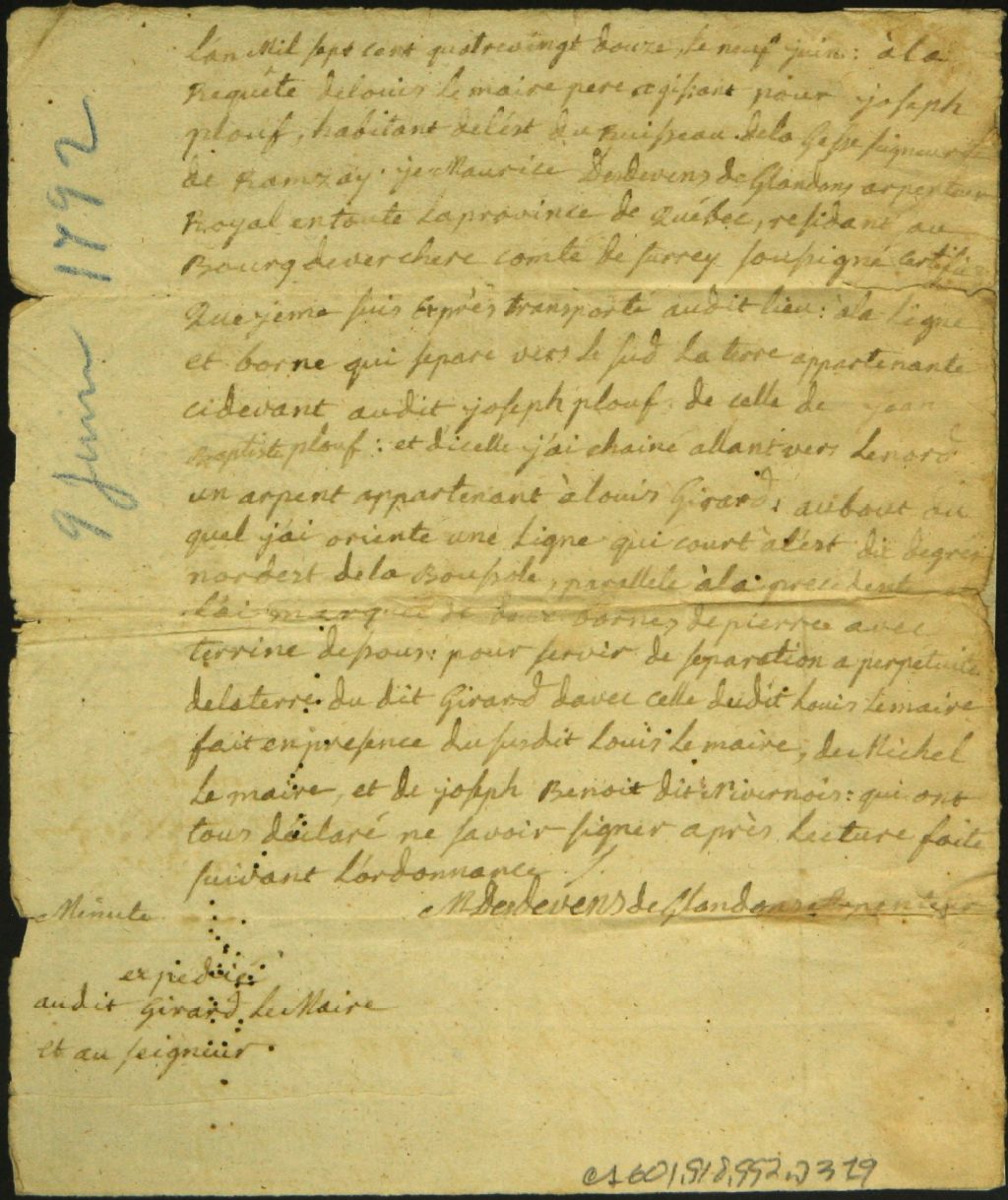 Procès-verbal de bornage, à la requête de Louis Lemaire, père, agissant pour Joseph Plouf, d'un emplacement situé à l'Est du ruisseau de la Gesse dans la seigneurie de Ramezay, 9 juin 1792, Archives nationales à Montréal, Fonds Cour supérieure. District judiciaire de Montréal. Greffes d'arpenteurs, (06M,CA601,S18,SS2,D379).