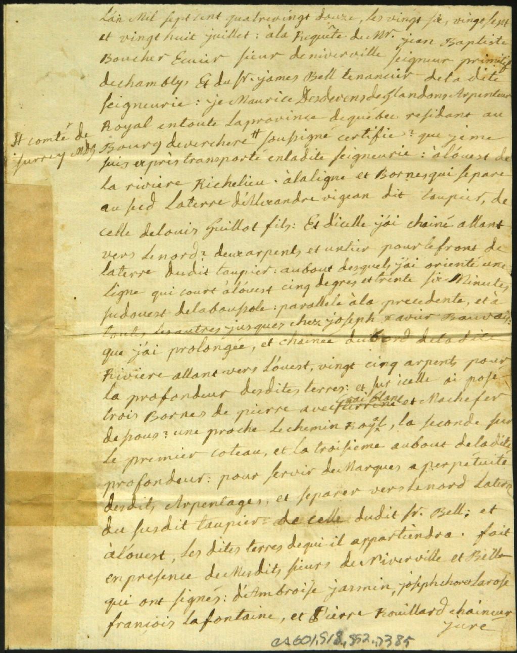 Procès-verbal d'arpentage et de bornage, à la requête de James Bell et Jean Baptiste Boucher, sieur de Niverville et seigneur primitif de Chambly, d'un emplacement situé à Chambly (Niverville), 26 juillet 1792-28 juillet 1792, Archives nationales à Montréal, Fonds Cour supérieure. District judiciaire de Montréal. Greffes d'arpenteurs, (06M,CA601,S18,SS2,D385).